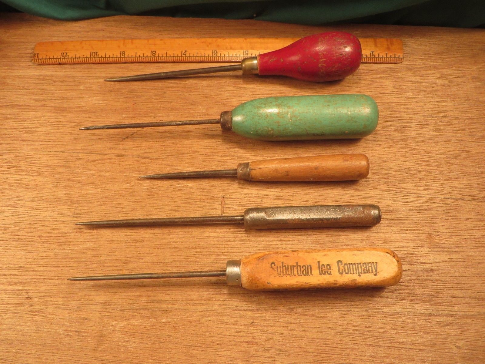 Title (ebay affiliate link): 5 Vintage Awls / Ice Picks Carpentry Woodworking Wooden Handles Advertising VGC