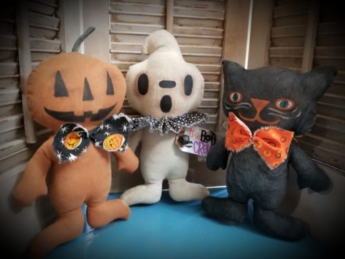 Title (ebay affiliate link): Primitive Halloween Pumpkin, Cat, & Ghost Doll Ornies ~The Boo Crew~