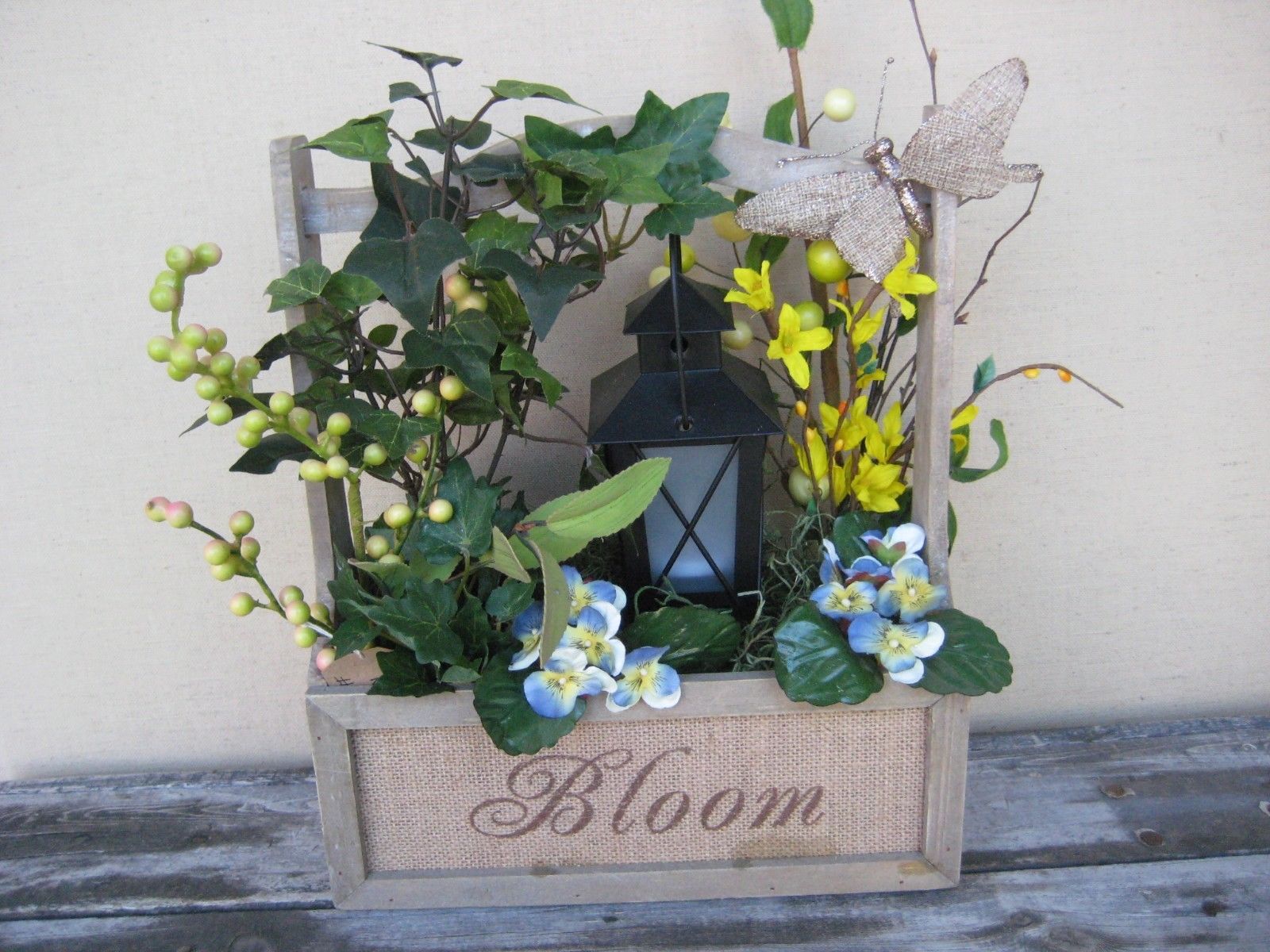 Primitive Lantern and Tote Box Flower Arrangement Table Centerpiece Decoration