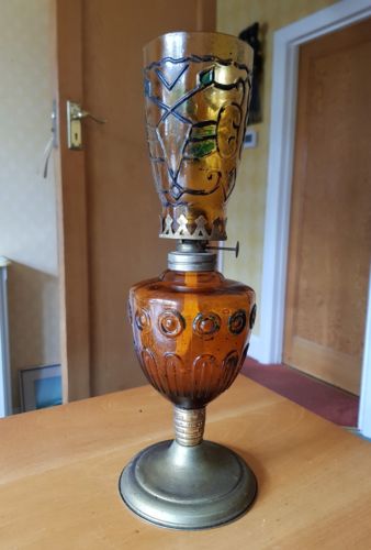 Title (ebay affiliate link): Vintage 1950s Antique Colourful Amber Glass Pixie Wick Parafin Oil Lamp on Stand