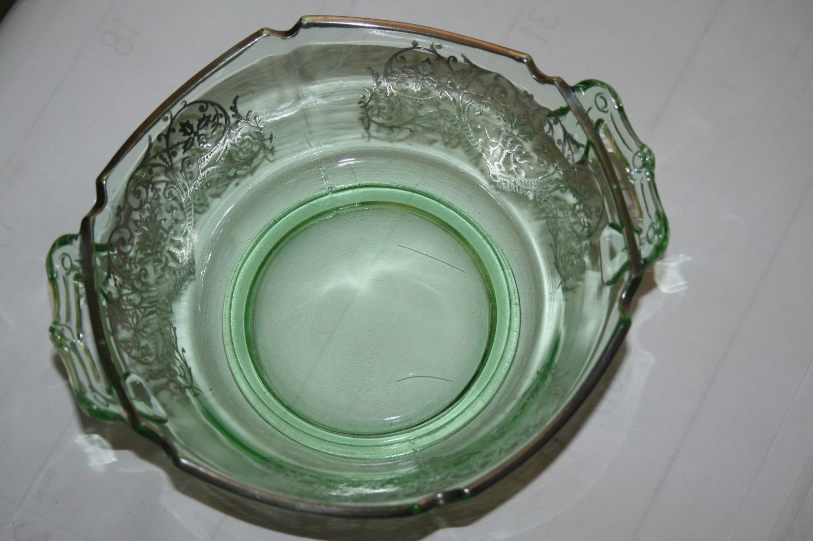 Title (ebay affiliate link): Green Depression Glass Handled Candy Dish With Sterling Overlay marked sterling