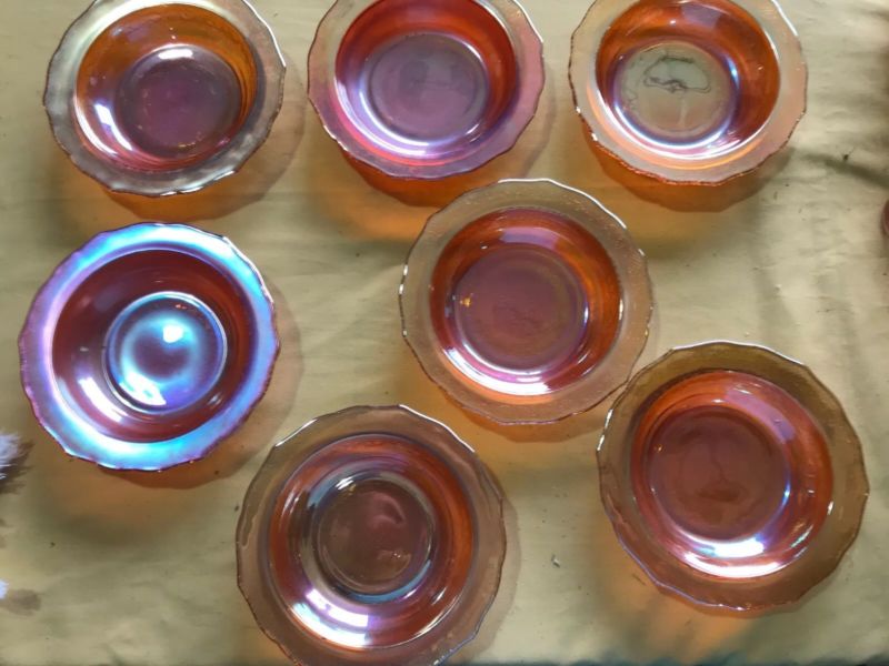 Title (ebay affiliate link): 7 Vtg. Federal Glass Normandie, Iridescent Bouquet & Lattice Soup/Cereal Bowls