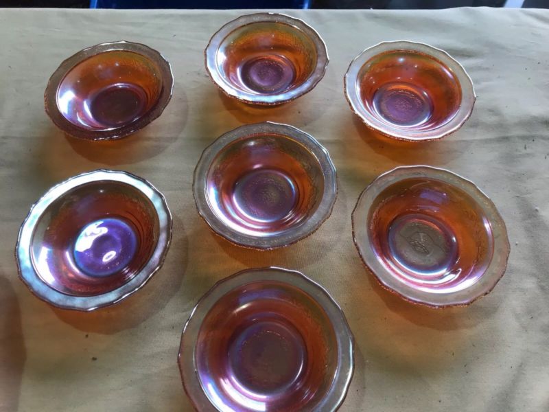 Title (ebay affiliate link): 7 Iridescent Normandie Bouquet and Lattice Berry/Dessert Bowls Federal Glass Co.