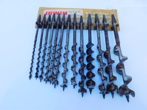 Title (ebay affiliate link): IRWIN Vintage 13 Piece Auger Bits in Tin Wall Display (2 bits not be Irwin)