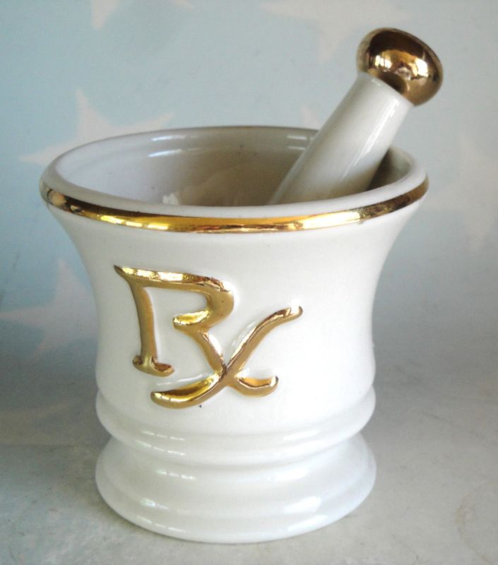 Title (ebay affiliate link): VINTAGE PHARMACIE DRUGSTORE WHITE CERAMIC APOTHECARY JAR & PESTLE