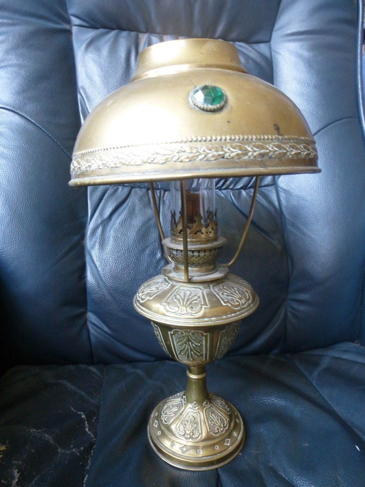 Title (ebay affiliate link): Antique French Arts and Crafts brass Oil Lamp and matching brass Jeweled Shade