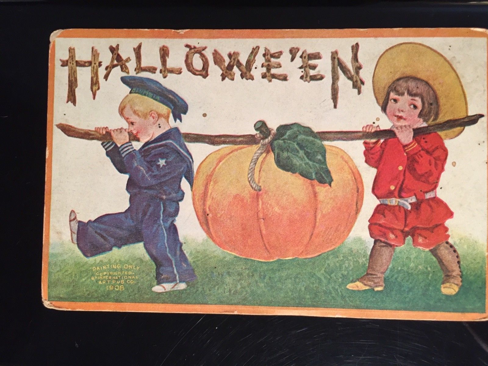 Title (ebay affiliate link): Vintage Halloween Postcard: 1908 Int. Arts Sailor Boy & Girl Carry HUGE Pumpkin