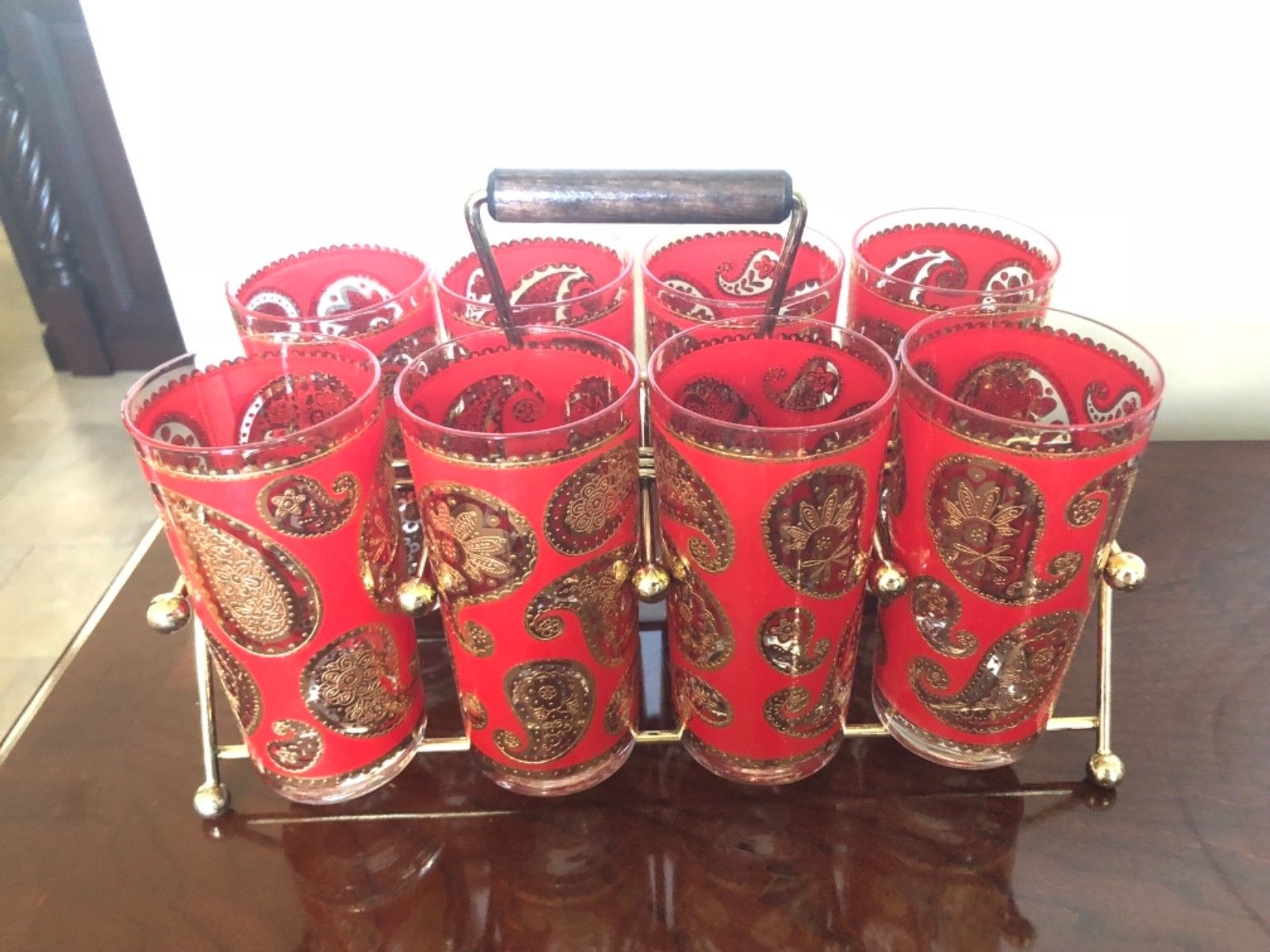 Title (ebay affiliate link): Excellent Vintage Culver set 8 Glasses Cups Red Gold Paisley w/ Caddy