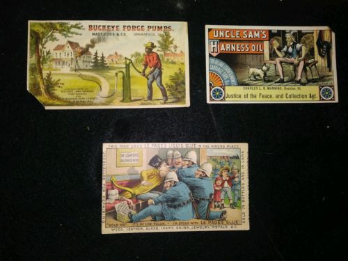 Lot of 3 1800s Advertising Trade Card Buckeye Pumps, Uncle Sams Harness Oil