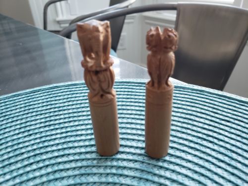 Title (ebay affiliate link): Vintage Hand Carved Wooden Elephant & Wild Cat Figures on Wooden Dowel Sticks, 2