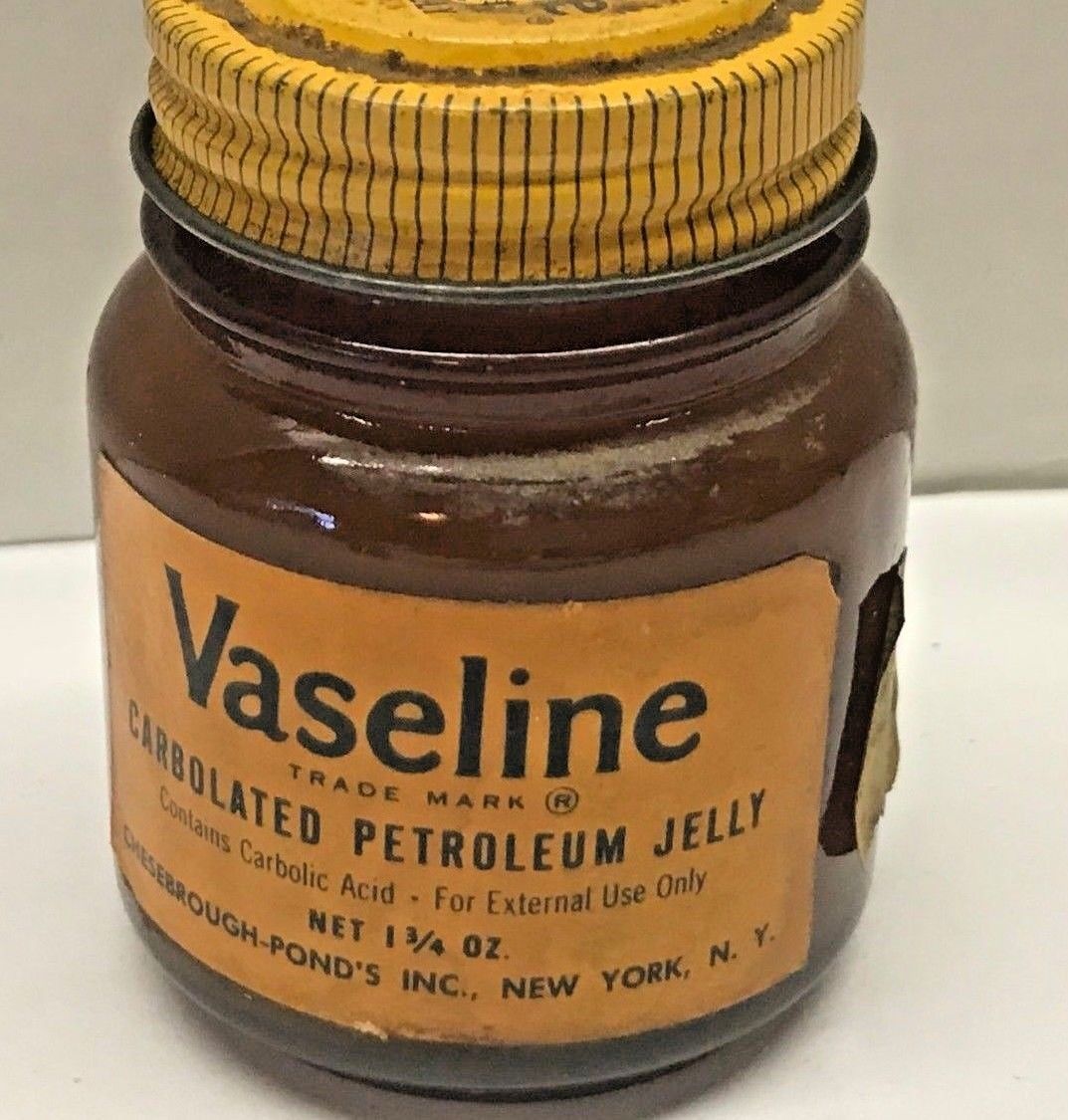 Title (ebay affiliate link): ANTIQUE PHARMACY MEDICINE VASELINE PETROLEUM JELLY Brown GLASS JAR Chesebrough
