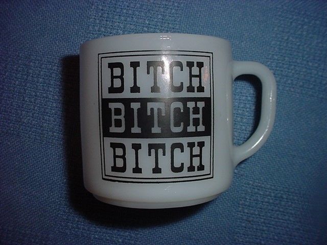 Title (ebay affiliate link): Vintage Federal Glass HEAT PROOF Milk Glass BITCH BITCH BITCH Novelty Mug Cup