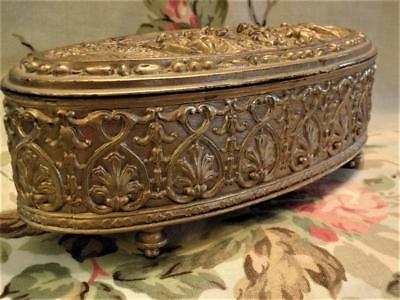 LARGE FIGURAL REPOUSSE METAL J.B. HINGED, FOOTED JEWELRY CASKET, BOX~~ NO RES.