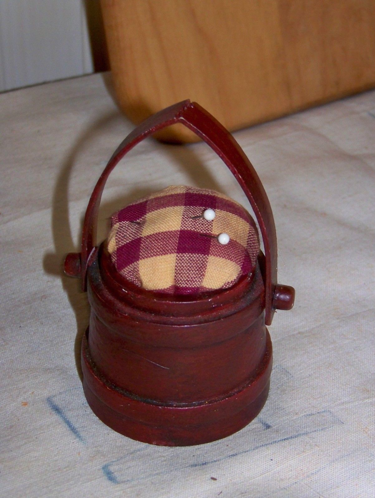 Title (ebay affiliate link): Primitive Painted Sm Salesman Sample Sugar Bucket Firkin Swing Handle Pincushion