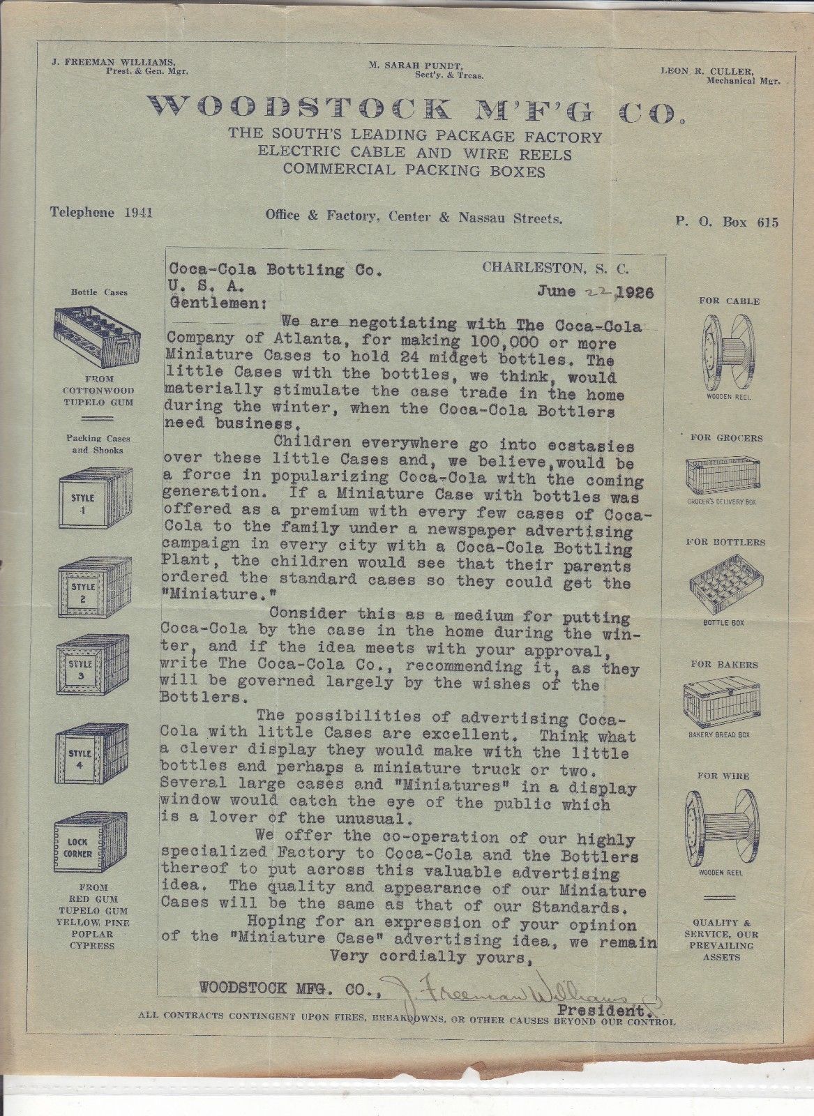 WOODSTOCK MFG CO. LETTERHEAD DATED JUNE 22, 19 MFG COCA-COLA CASES