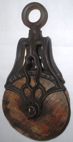 Title (ebay affiliate link): ANTIQUE F.E.M. & BRO ASHLAND OH MYERS CAST IRON & WOOD FARM BARN HAY PULLEY NICE
