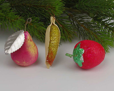 Title (ebay affiliate link): 3 x Vintage Spun Cotton Christmas Ornaments,maize,pear,strawberry,