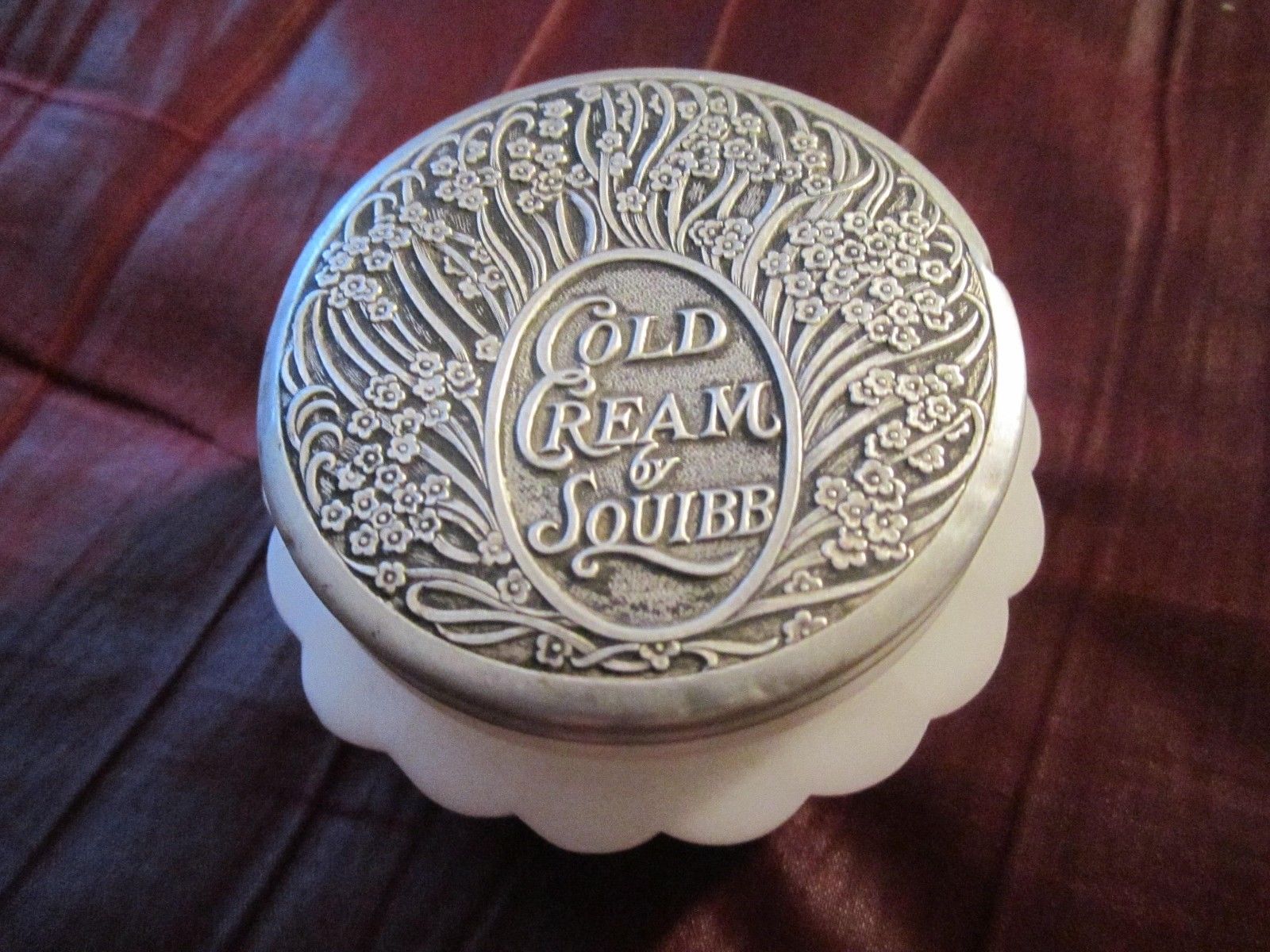 Title (ebay affiliate link): SQUIBB COLD CREAM VINTAGE MILK GLASS LIDDED JAR FROM ESTATE COLLECTION
