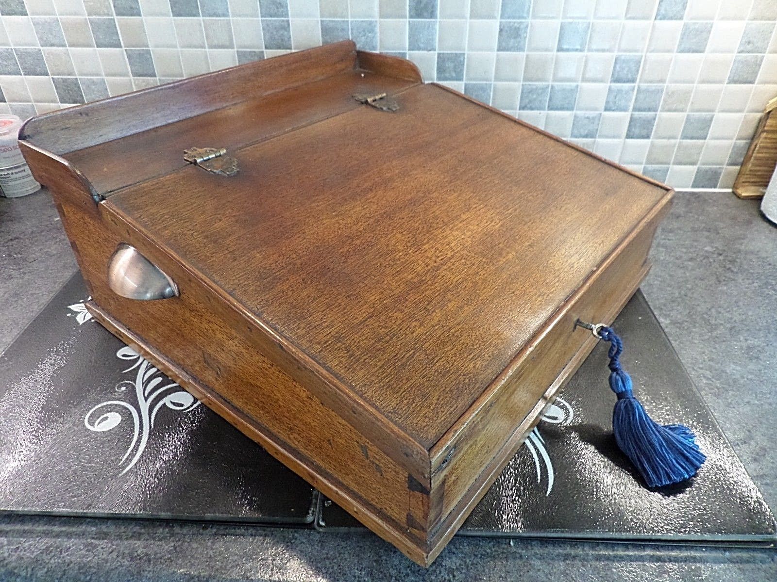 Title (ebay affiliate link): EARLY 20thC MAHOGANY BANKERS/ CLERKS TABLE TOP WRITING DESK & SLOPE- LOCK & KEY