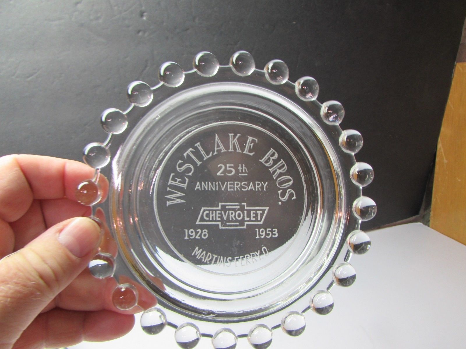 Title (ebay affiliate link): VINTAGE WESTLAKE BROTHERS CHEVROLET CAR DEALER 1953 ADVERTISING BOWL CANDLEWICK
