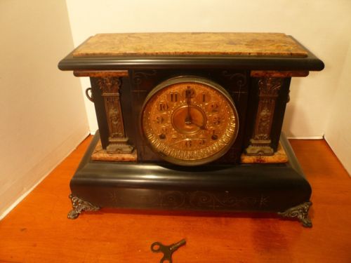 Title (ebay affiliate link): ANTIQUE SETH THOMAS ADAMANTINE BLACK MANTEL CLOCK + KEY DATED 1896 PARTS REPAIR
