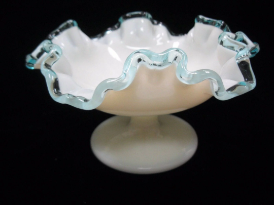 Title (ebay affiliate link): VINTAGE FENTON WHITE MILK GLASS SILVER CREST RUFFLED PEDESTAL COMPOTE CANDY DISH