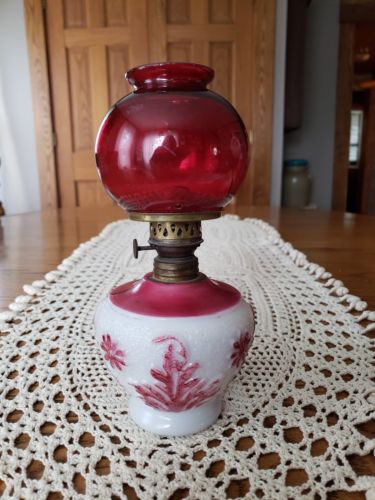 Title (ebay affiliate link): Antique Miniature Oil Lamp Ruby Red Globe & Embossed Milkglass Base 8"T