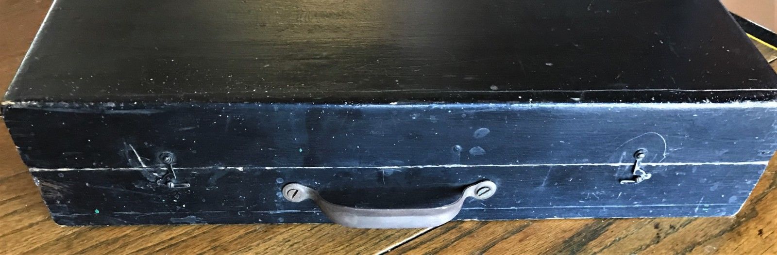 Title (ebay affiliate link): Old Wooden Box Wood Original Black Paint 9.5" x 16.5" x 3 1/4" Hardware