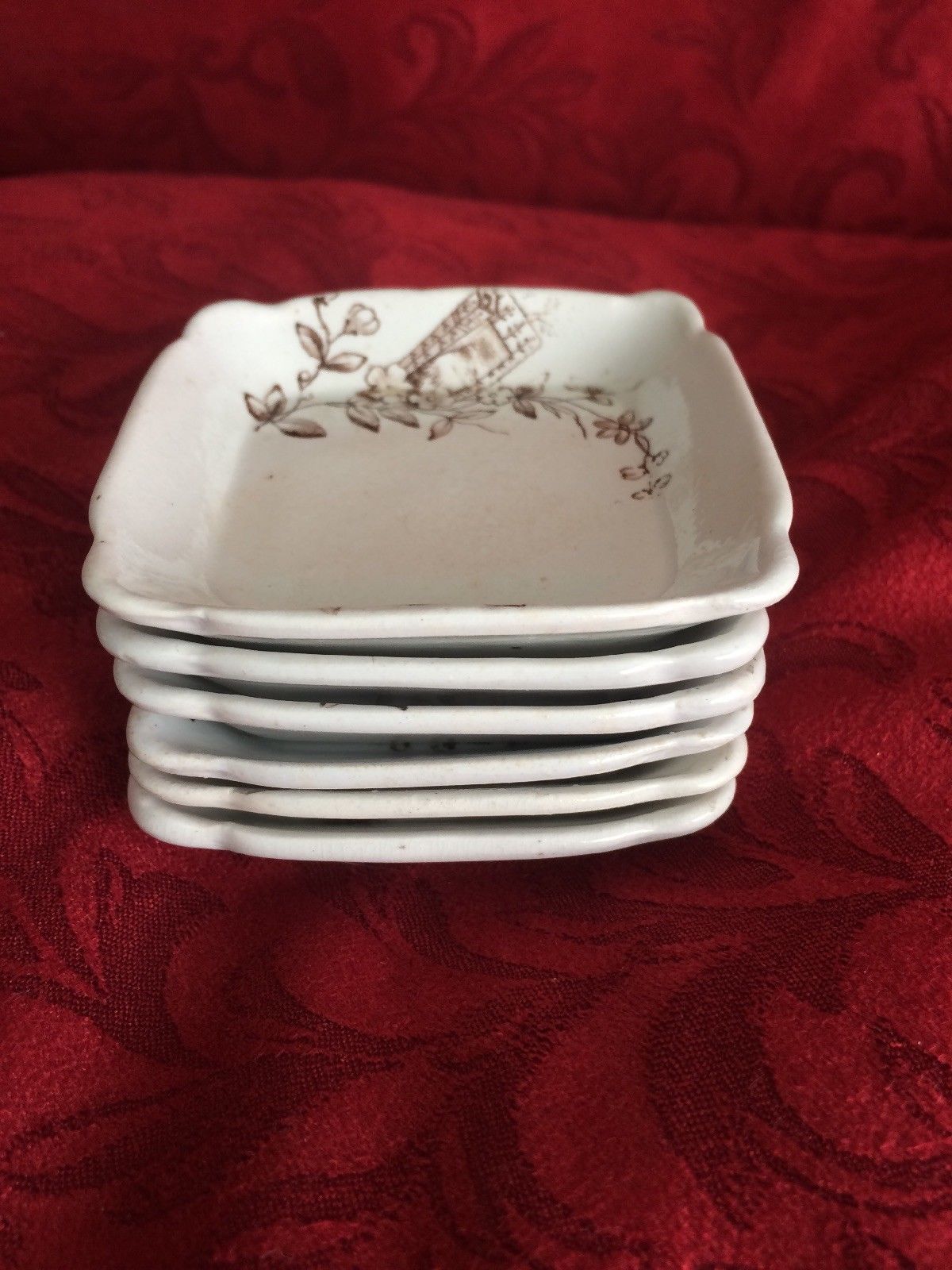 Title (ebay affiliate link): RARE! 6 SALT CELLARS Edge Malkin & Co Transferware Trentham Ironstone 1884