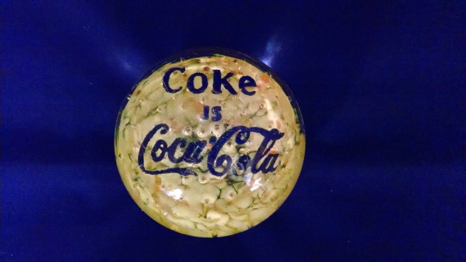 Vintage "Coke is Coca-Cola" Glass Paperweight 1940''s RARE Blue & Yellow