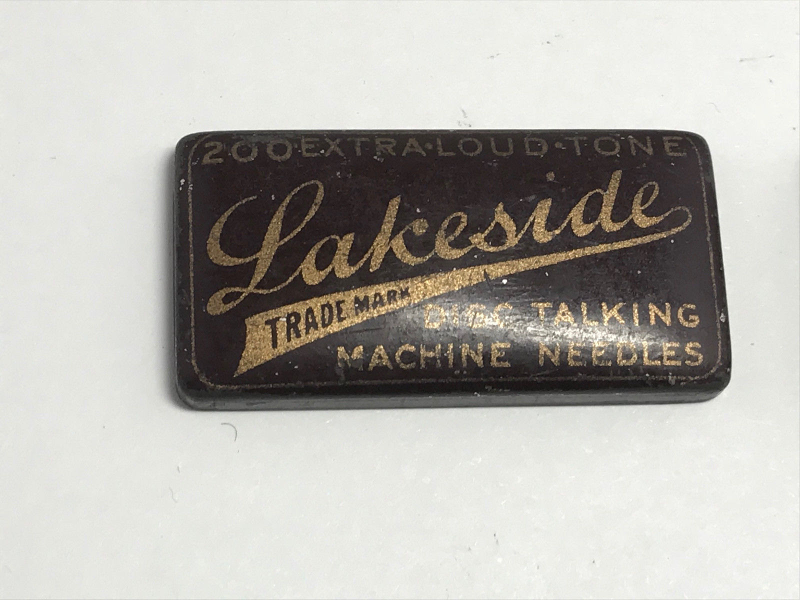Title (ebay affiliate link): Antique LAKESIDE Disc Talking Machine Extra Loud Tone TIN Box 200 Needles approx