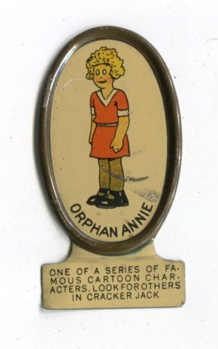Title (ebay affiliate link): Early Little Orphan Annie Tin Litho Cracker Jack Prize or Premium 1930''s Clean