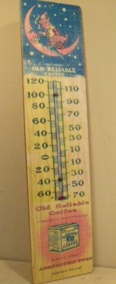 Old Reliable Coffee Wood Adv.Thermometer Artist /Moon