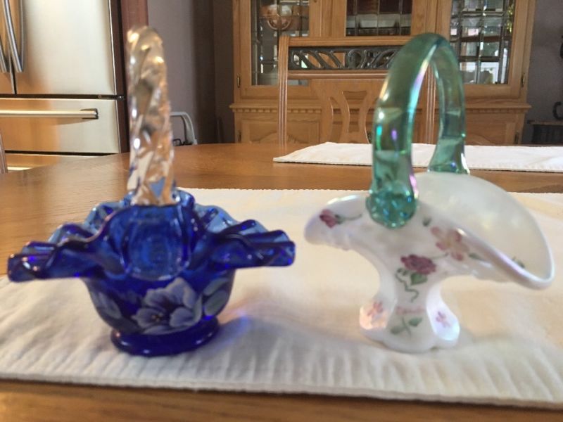 Fenton Mini Basket Set- Hand Painted Cobalt Blue& Hand Painted Milk Glass