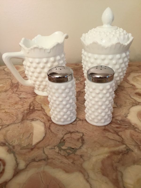 Title (ebay affiliate link): FENTON Hobnail White Milk Glass Sugar Bowl Creamer Salt Pepper