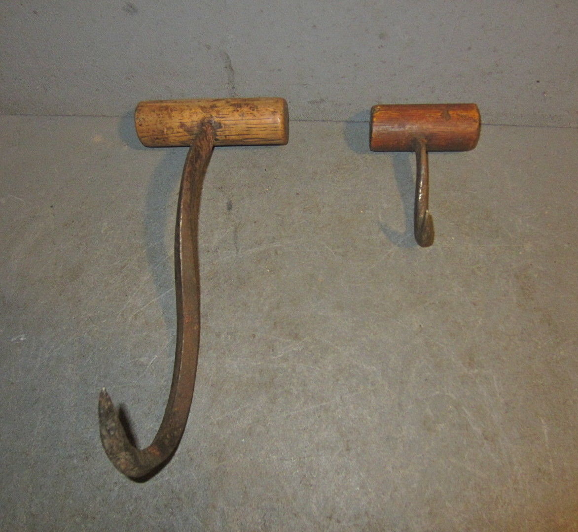 2 VINTAGE WOOD HANDLE HAY HOOKS ~ RUSTIC FARM TOOL ~ STRAW BALE, ICE BLOCK, MEAT