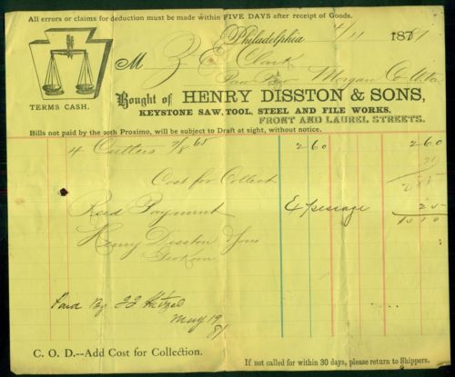 Title (ebay affiliate link): 1881 Henry Disston & Sons Keystone Saw,Tool,Steel and File Works Invoice-Phila.