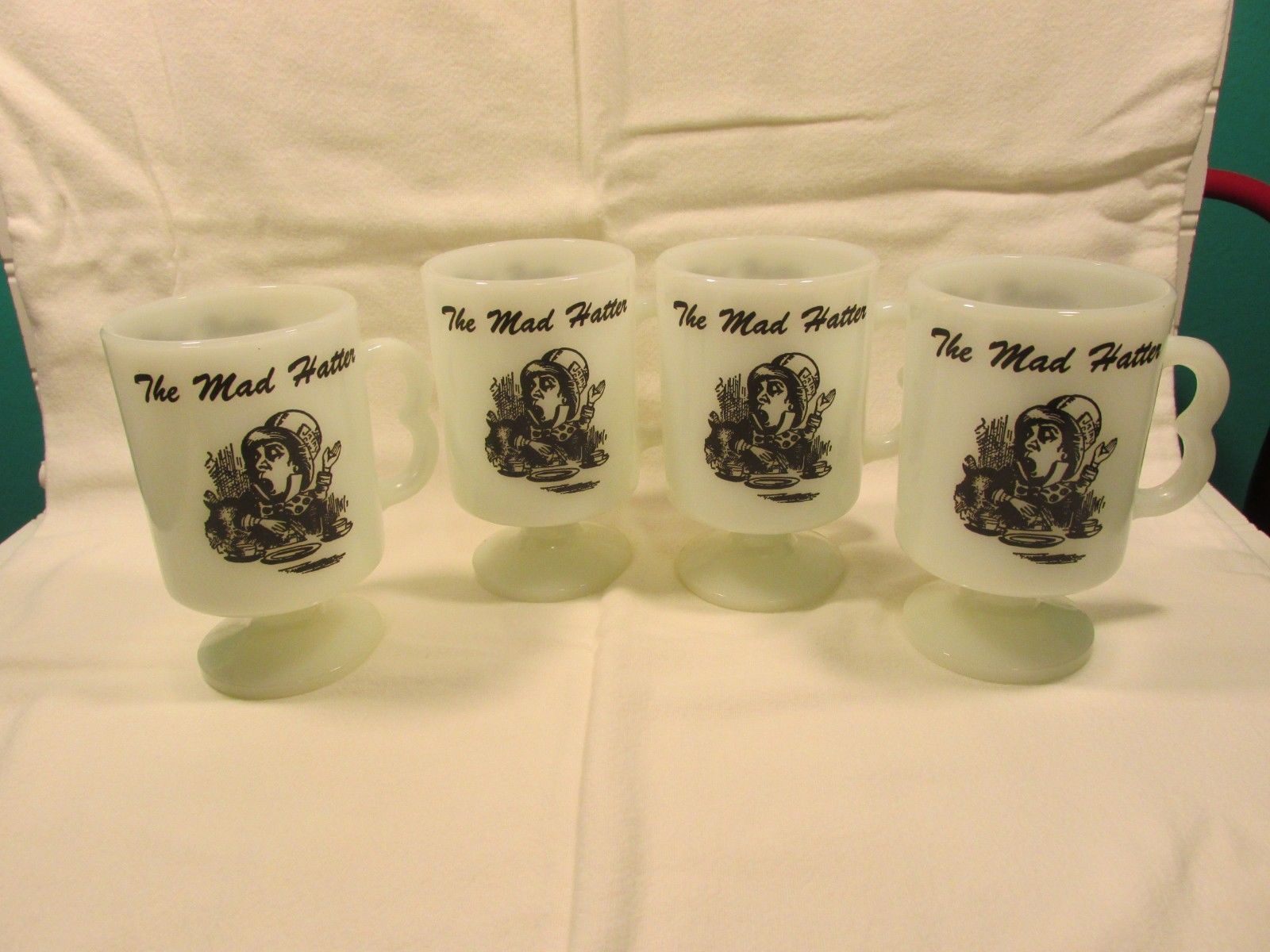 Title (ebay affiliate link): VINTAGE ALICE AND WONDERLAND MAD HATTER MILK GLASS PEDESTAL B HANDLE COFFEE MUGS