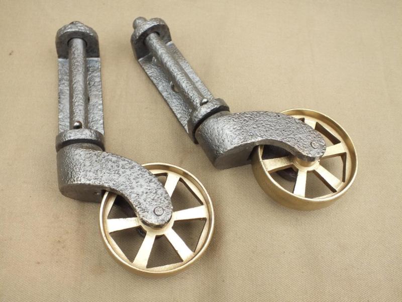 SUPERB PAIR ANTIQUE FURNITURE CASTORS WHEELS TROLLEY WHEELS CAST IRON & BRASS