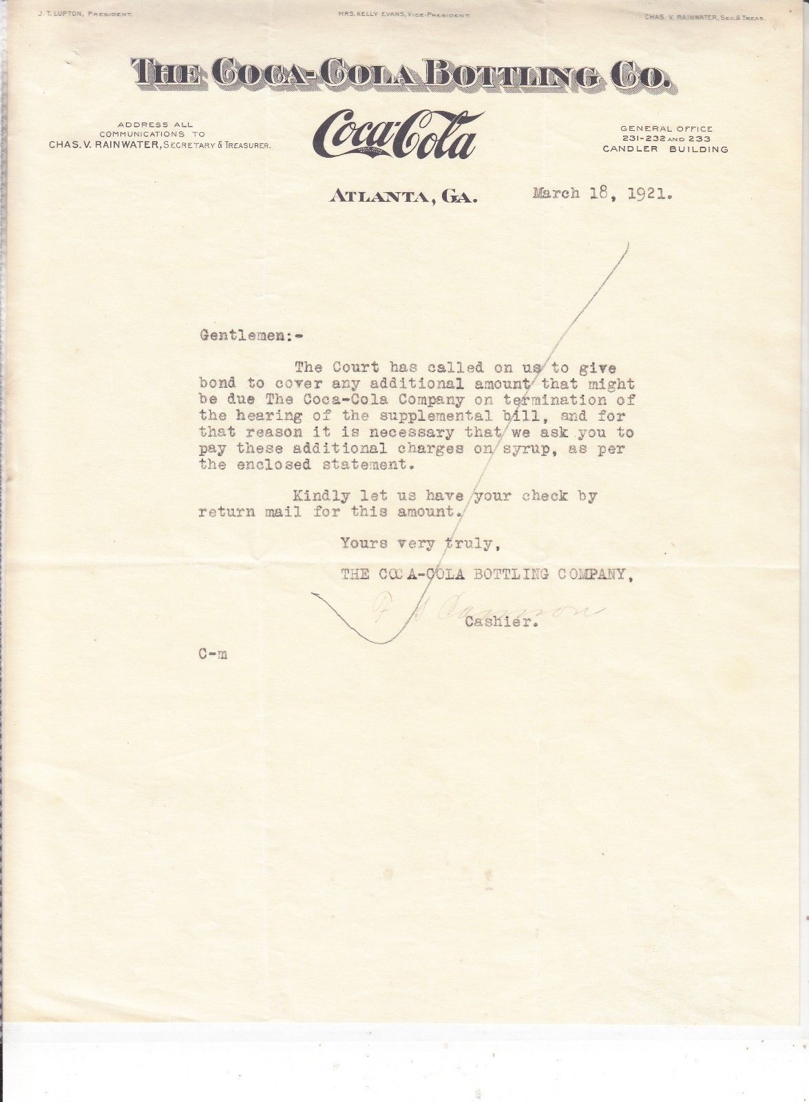 THE COCA-COLA BOTTLING COMPANY ATLANTA GA. LETTERHEAD DATED MARCH 18, 1921