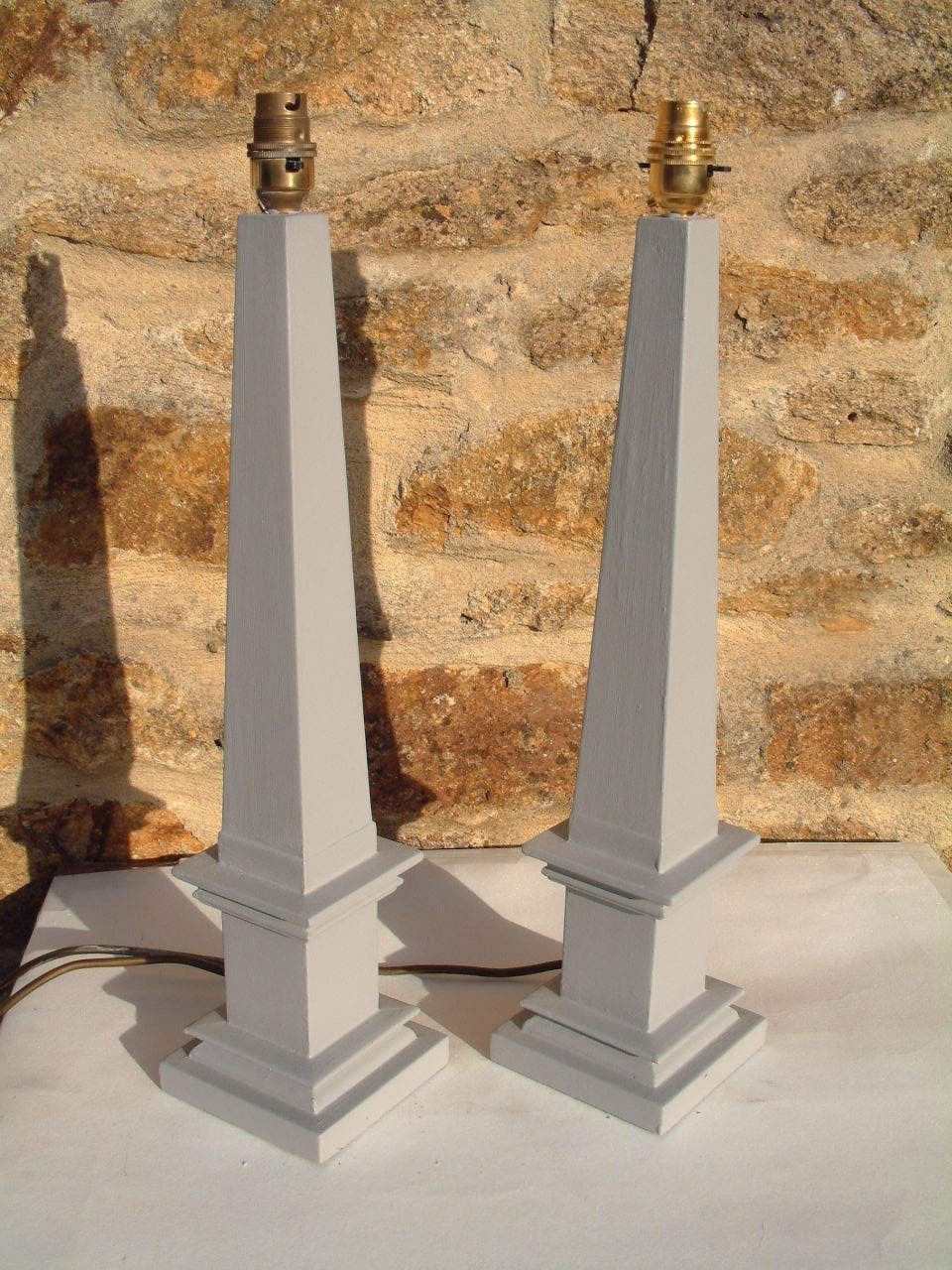 Title (ebay affiliate link): VINTAGE pair of tall painted wooden obelisk column lamps.