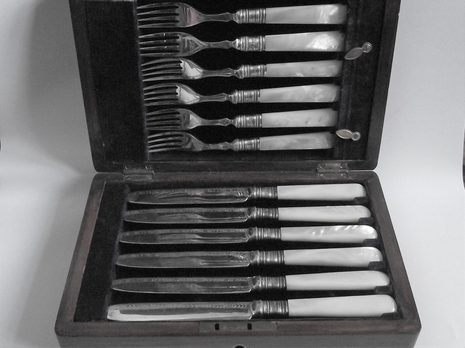 Title (ebay affiliate link): Antique Sheffield plate and silver collar mother of pearl pastry Knives & Forks