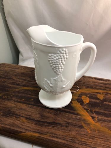 Title (ebay affiliate link): Large Vintage White Milk Glass Pedestal Pitcher w/ Ice Lip Grapes and Leaves
