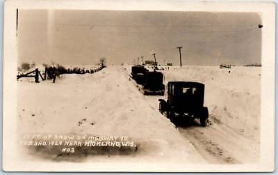 1929 Highland, Wisconsin RPPC Real Photo Postcard "15 Ft. of Snow on Highway 80"