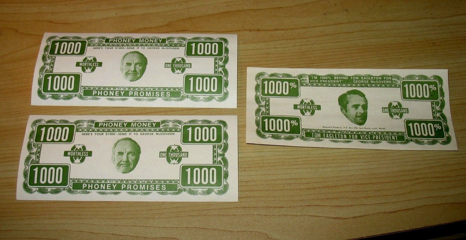 Title (ebay affiliate link): Three (3) 1972 Pro Nixon Anti-McGovern / Eagleton "Phoney Money" campaign