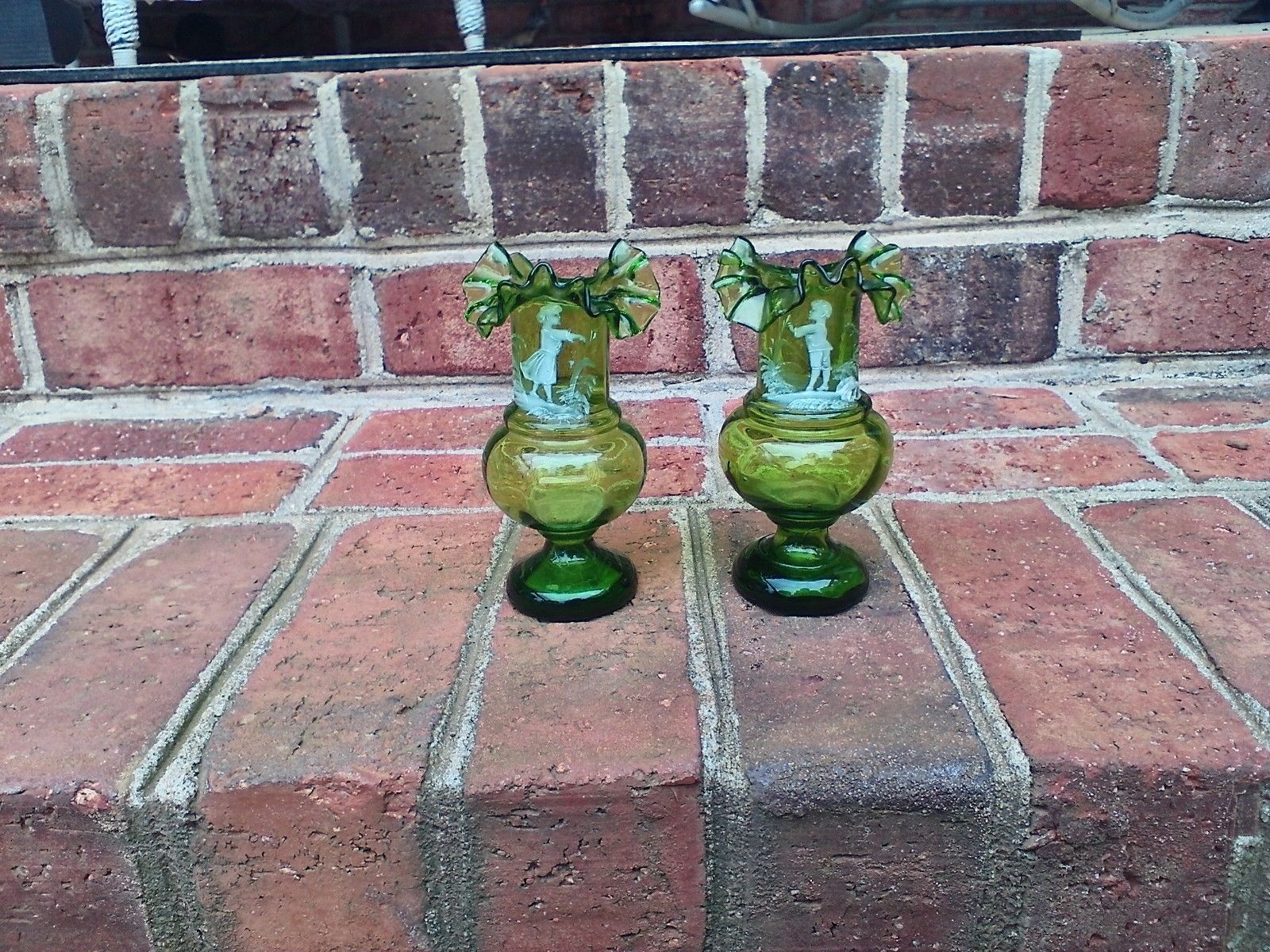 Mary Gregory hand painted boy girl green blown glass vases