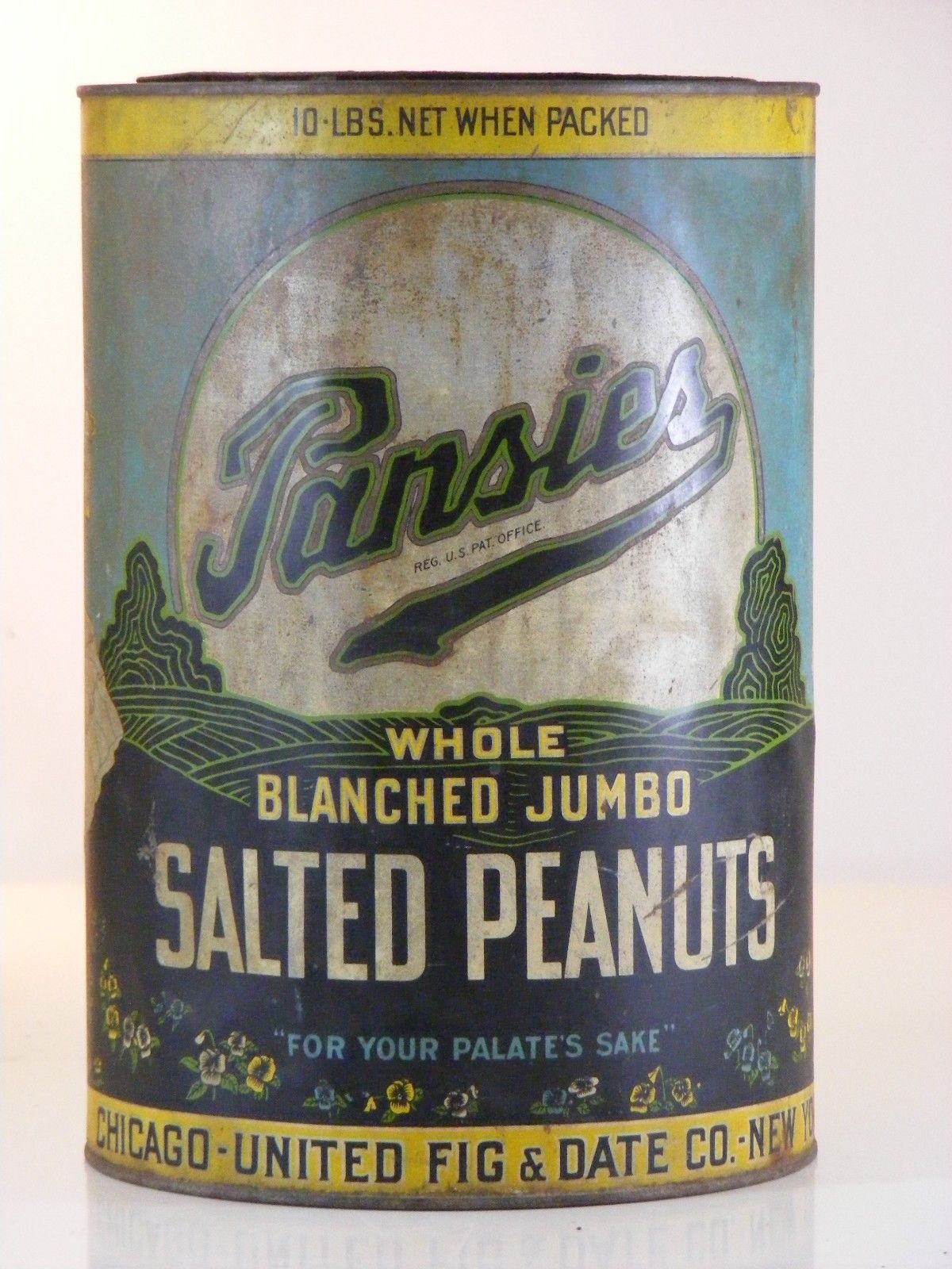 Title (ebay affiliate link): Very Large, 10 LB Vintage Pansies Peanut Tin. Great graphics