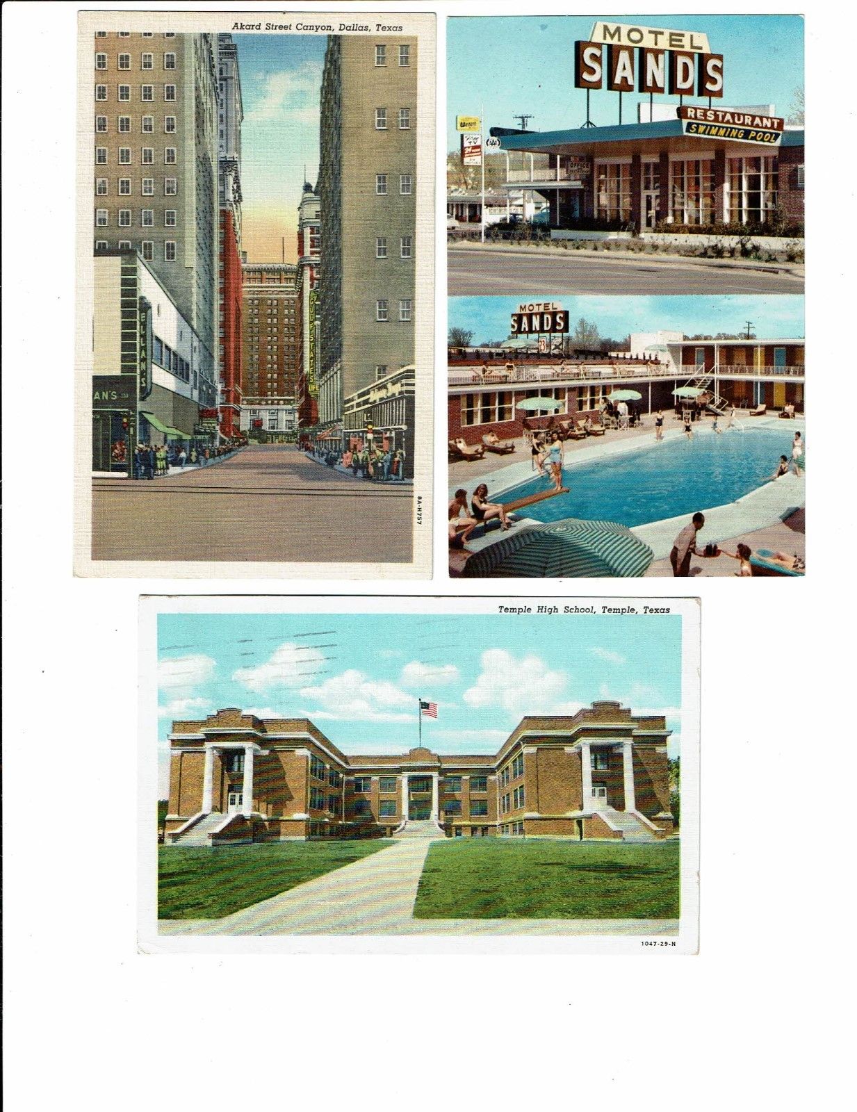 Title (ebay affiliate link): 3 Card Texas Lot, Texarkana Motel, Temple School, Dallas Canyon!