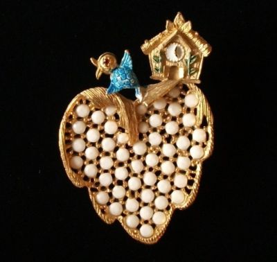 Vintage Bluebird House on Goldtone Brooch Milk Glass