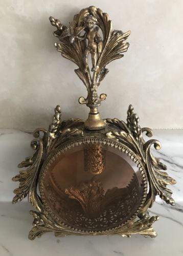 Title (ebay affiliate link): Vintage Ormolu Gold CHERUB PERFUME BOTTLE Beveled Amber Filigree Glass